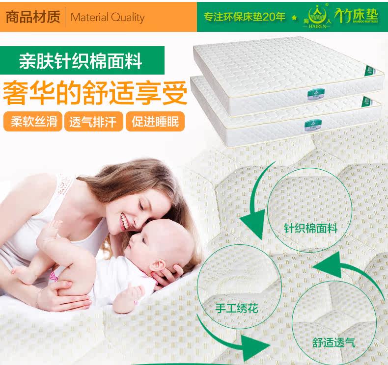 海人竹床墊,改變了140多年來世界床墊基本用鋼絲彈簧做內(nèi)膽的結(jié)構(gòu)工藝,克服了彈簧生銹變形的缺陷,解決了棕板容易生蟲的世界難題,是一種取代彈簧床墊棕床墊的新型床墊。